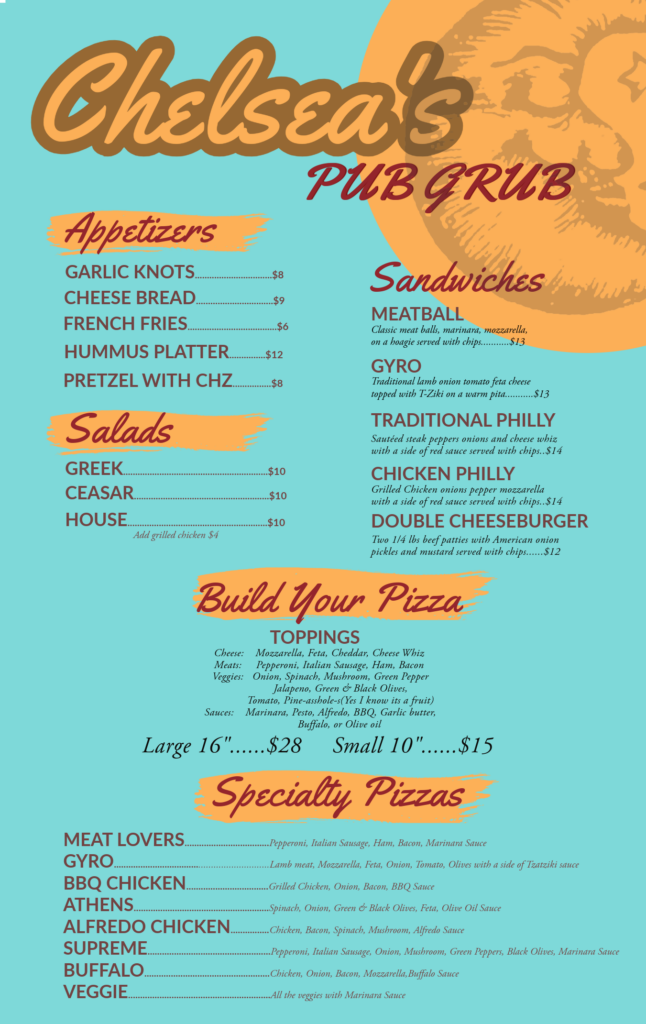 chelsea's cafe AND pATIO on the 2nd floor upstairs - DINE IN OR PICK UP