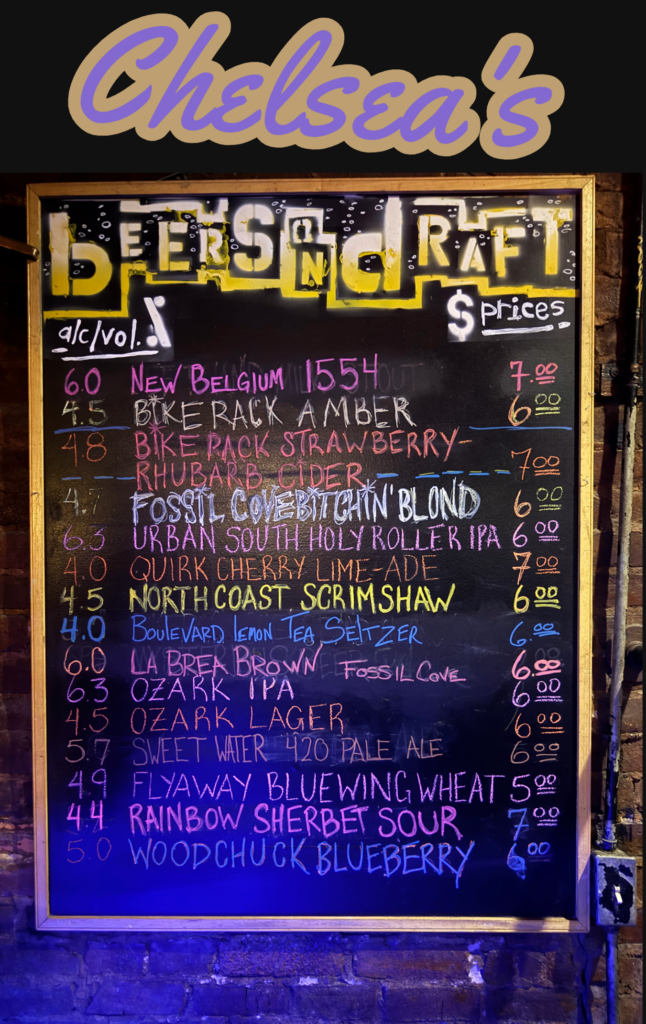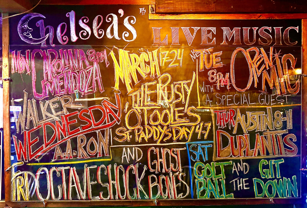 FOR OVER 35 YEARS, CHELSEA’S HAS BEEN KNOWN BY LOCALS AND VISITORS AS THE PLACE TO BE IN EUREKA SPRINGS, ARKANSAS. KNOWN AS THE “HIDDEN GEM” OF DOWNTOWN EUREKA, IT’S WHERE EVERYONE COMES TO STAY UNTIL 2 AM. SO COME DANCE, LISTEN TO LIVE MUSIC, PLAY POOL, EAT PIZZA & DELICIOUS SALADS, SING AT OPEN MIC, AND HAVE A FULL BAR EXPERIENCE. CAFE UPSTAIRS DOES CLOSE BEFORE THE BAR DOWNSTAIRS, SO CLICK THE CAFE MENU TAB TO SEE KITCHEN HOURS. ENTER FROM SPRING STREET OR FROM MOUNTAIN STREET. LOCALS REFER TO IT AS BEING ‘SLIGHTLY OFF CENTER’ STREET. LOOK FOR THE BLACK AND WHITE PIANO KEYS LEADING UP TO THE ENTRANCE ON MOUNTAIN STREET OR ENTER ON THE SECOND LEVEL RIGHT OFF OF SPRING STREET NEAR THE PUBLIC RESTROOMS.